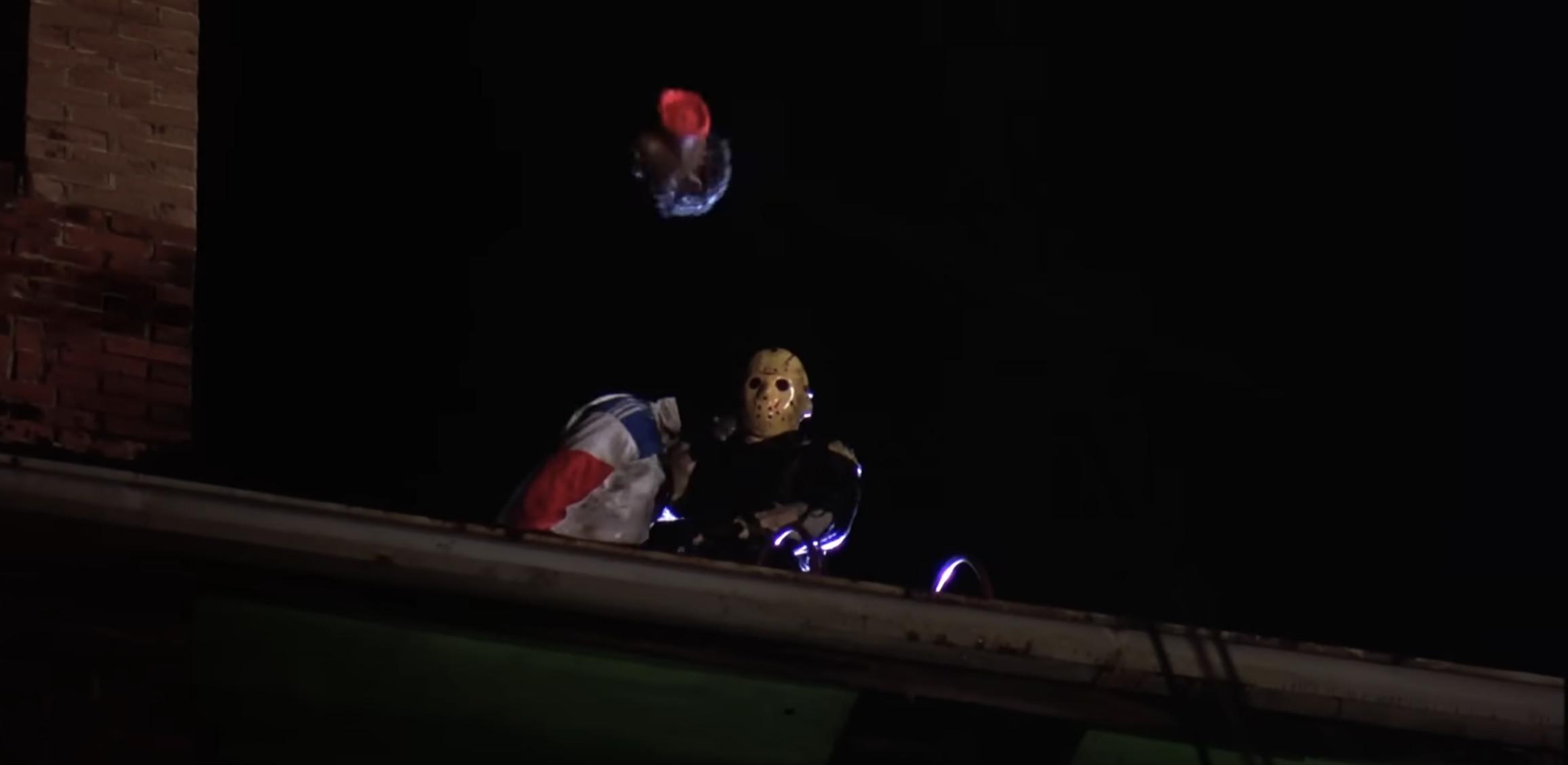 By my count, Julius Gaw (Vincent Craig Dupree) lands 25 head shots and 33 body shots in his boxing match with Jason. All the punches do is move Jason a few feet and bloody Gaw’s knuckles, but the sound and slow-motion effects are top-notch. Out of breath, Julius tells Jason, “Take your best shot, motherfucker.” Jason does just that, knocking his (obviously fake) head off his shoulders and cleanly into an open dumpster. Swish! —Austin Gayle