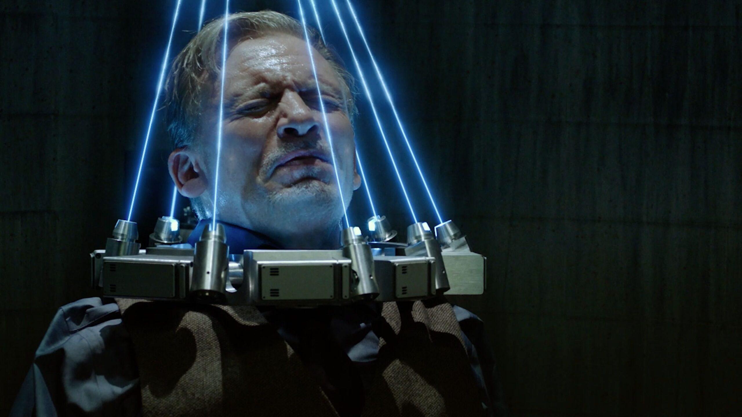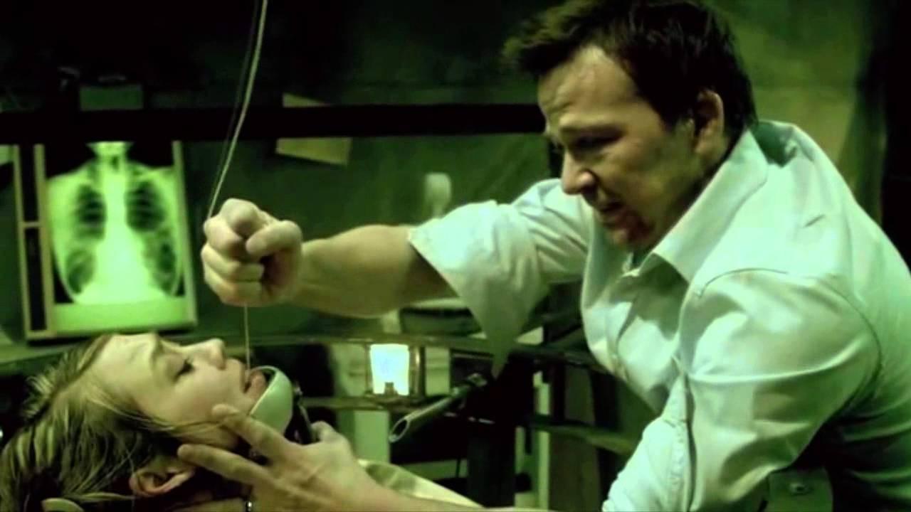 Rigg forces Ivan, a serial rapist, into a trap that will tear him apart at the limbs if he doesn’t remove both of his eyes. To remove his eyes, Ivan has to press down on two buttons that will send blades into his eye sockets.