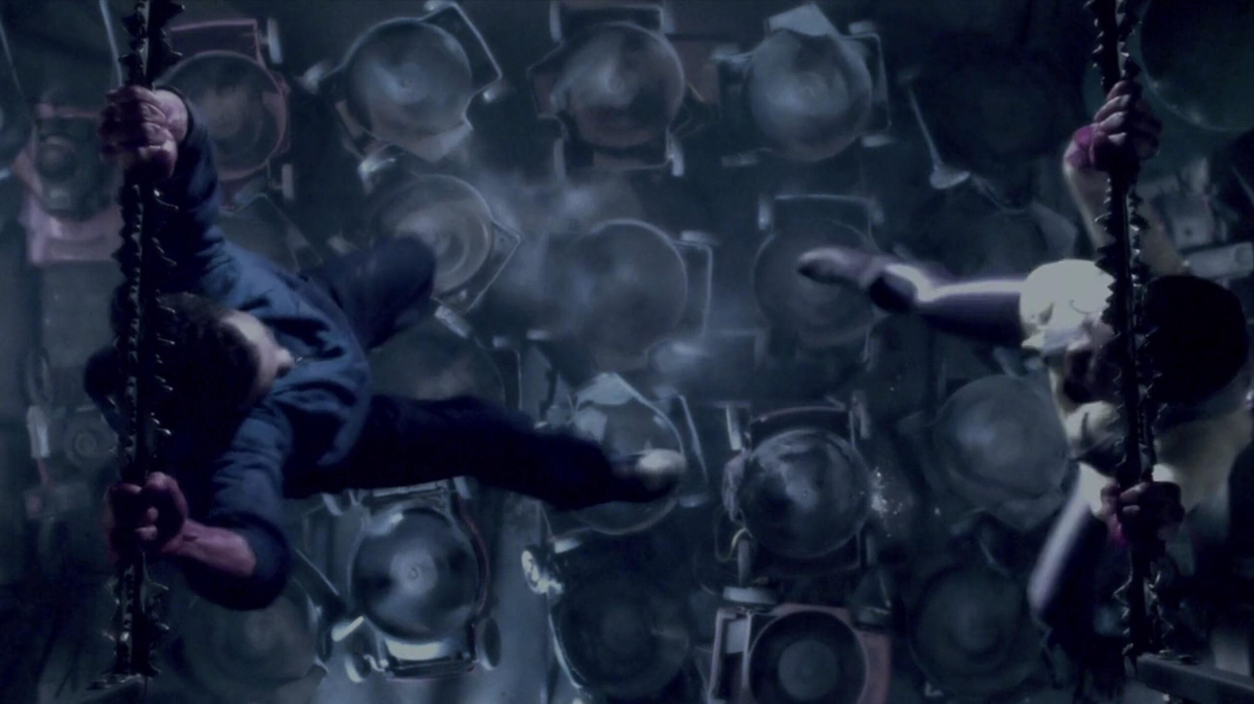 Bobby needs to ascend using two hooks connected to chains and connect electrical cords, or else his lover, Joyce, will roast inside of a metal box. Because he needs two hands to connect the cords up top, he shoves the hooks into his pec muscles. That’s the wrong move. You have to try to fit the hooks into the belt loops of your jeans before stabbing the hooks through the meat of your chest. I get that the belt loops might not be strong enough to hold your weight, but Bobby’s chest doesn’t even hold his weight long enough for him to save his partner.