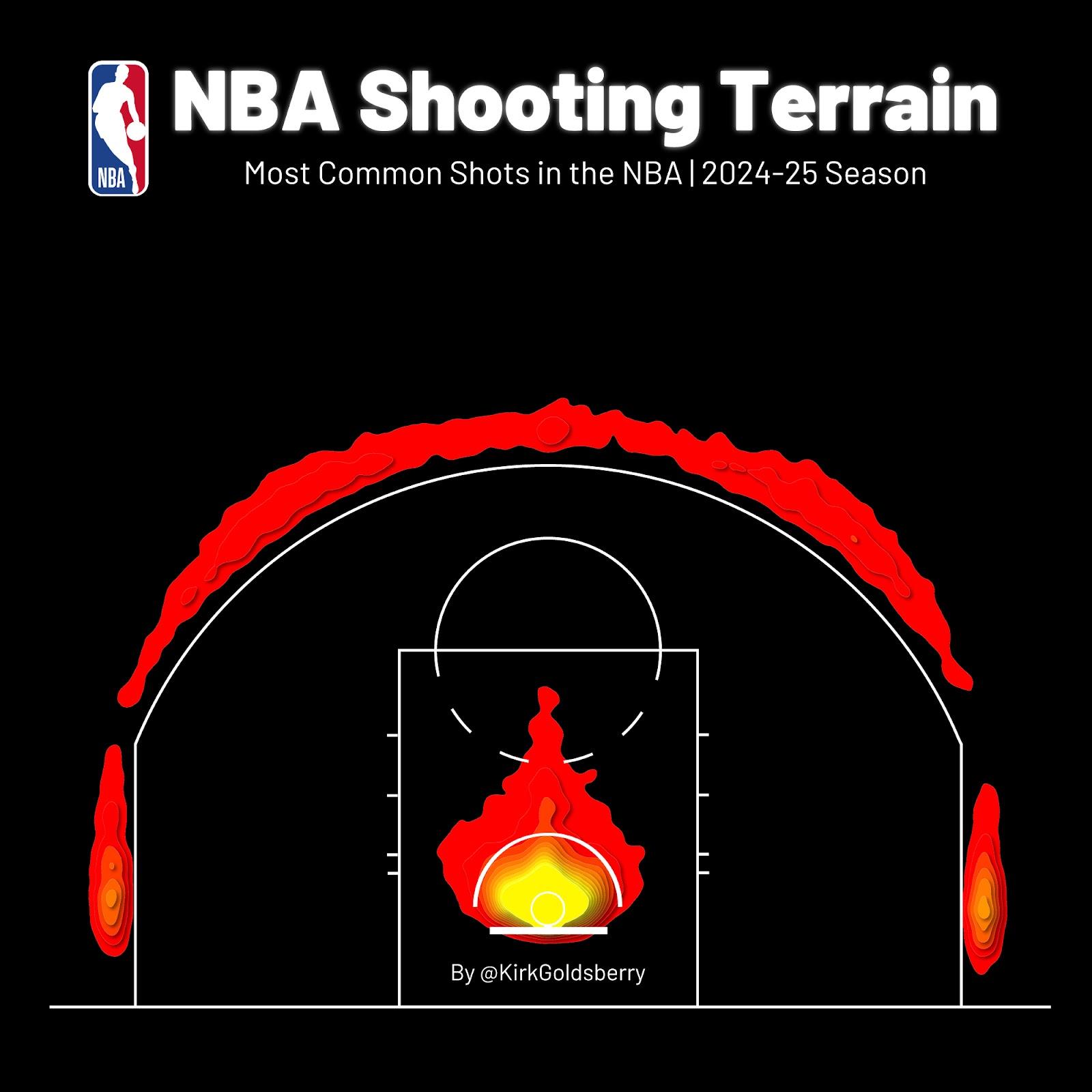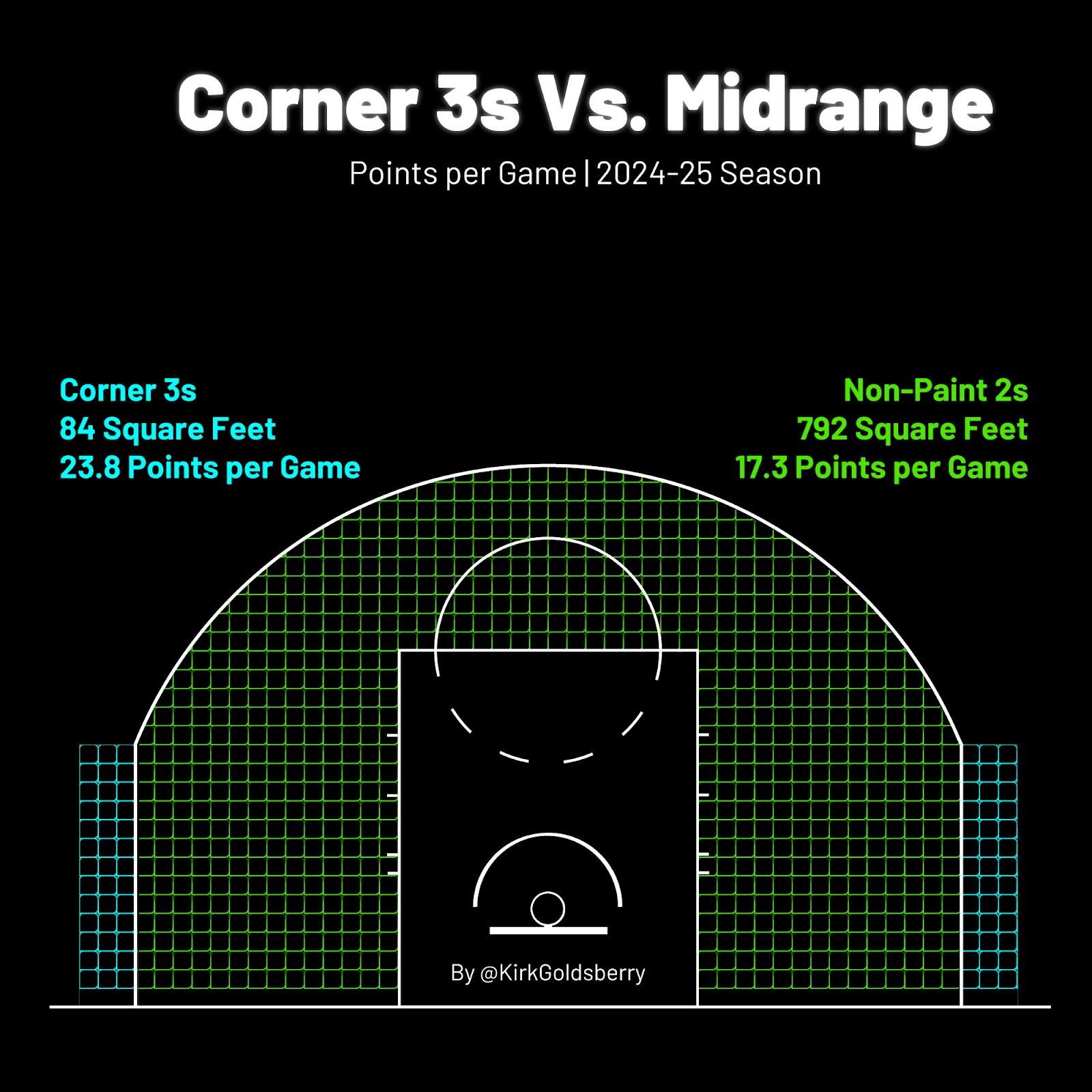 After a brief plateau, the league’s fervor for the 3-ball has surged again in 2024-25. An average 48-minute game now includes 75 shots from beyond the arc, up from 70 last season—that uptick is one of the biggest year-over-year increases in history. Modern offenses arrange themselves accordingly, in catch-and-shoot zones along the line. On today’s playing surface, the corner 3 is Boardwalk. The midrange jumper is Baltic Avenue.