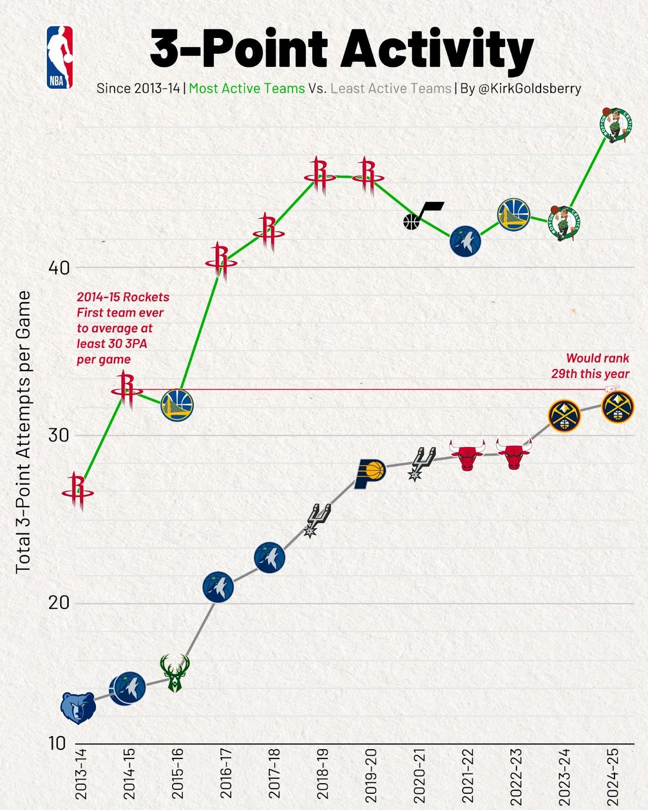 The defending champion Celtics epitomize these trends. Back in 2022, in his first season as head coach, Joe Mazzulla laid out his philosophy: “I love 3-pointers. I like math.” The numbers don’t lie. It’s half basketball, half portfolio theory. The Celtics launch 48.5 3s per night, which ranks first in the NBA, puts them on pace to shatter the all-time record, and sets them up to become the first team to shoot more than one 3 per minute of play. As of this writing, Boston has launched 3,636 triples in 3,625 total minutes. In all but 22 of their games this season, at least half of their shots have been 3s.