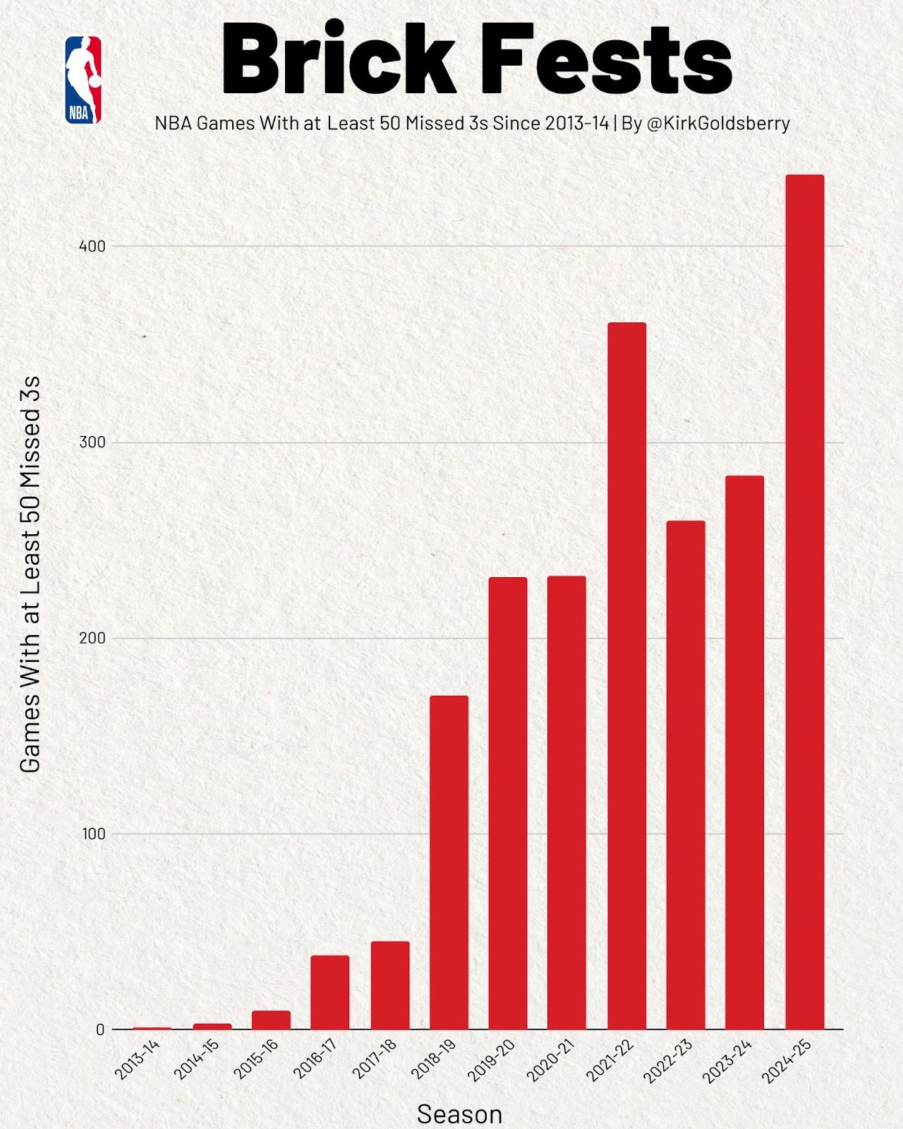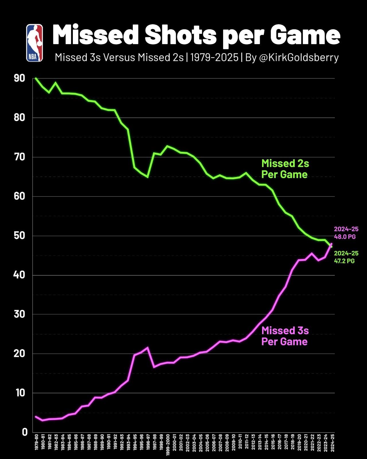 This season, we’ve crossed the Rubicon on a bridge built of bricks. For the very first time, missed 3s are more common than missed 2s.