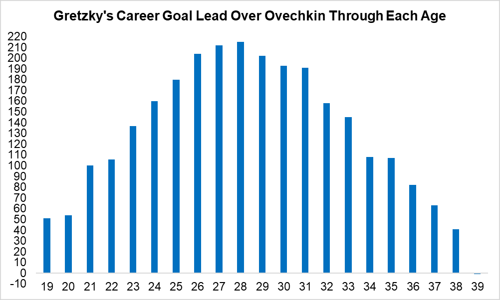 Yet statistically and stylistically, the two are drastically different—as evidenced by the fact that while Gretzky retired at age 38, the 39-year-old Ovi, who broke his leg last November and missed 16 games, has the fourth-most goals in the league this season (42), and the second-most goals per game behind the Oilers’ Leon Draisaitl. (Gretzky scored 42 or more goals in a season for the final time when he was 28.) This chart, which shows Gretzky’s cumulative goal lead over Ovechkin through each age, tells the tale of the tape.