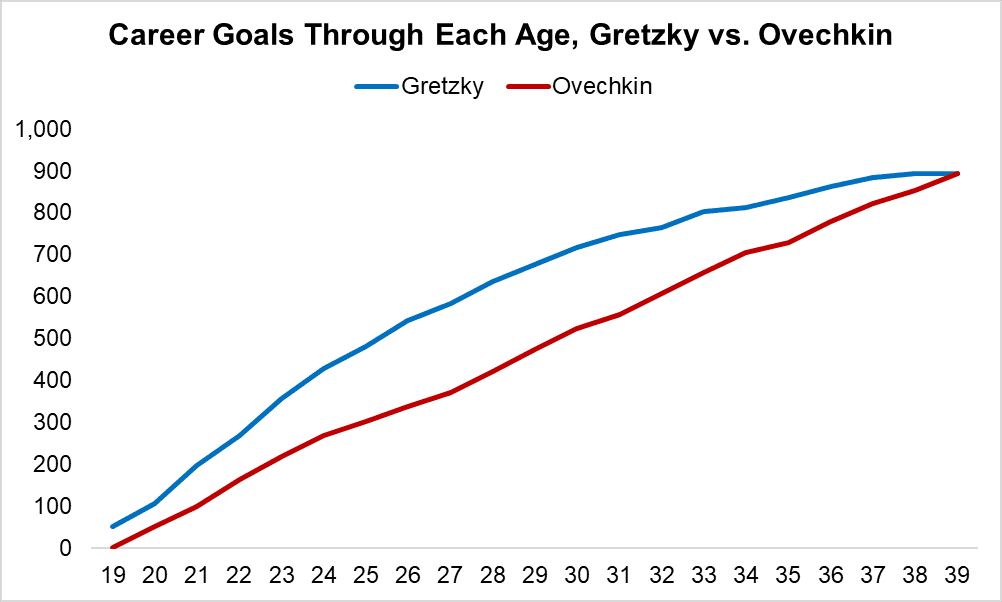 But then, that’s what we thought about Gretzky’s goals record before Ovechkin changed our minds. Compared to Gretzky, Maple Leafs center Auston Matthews isn’t on pace to score more than 894—but by age, if not number of seasons, he’s ahead of where Ovechkin was. Now we’ve just got to give him, or someone, time to blow our minds.