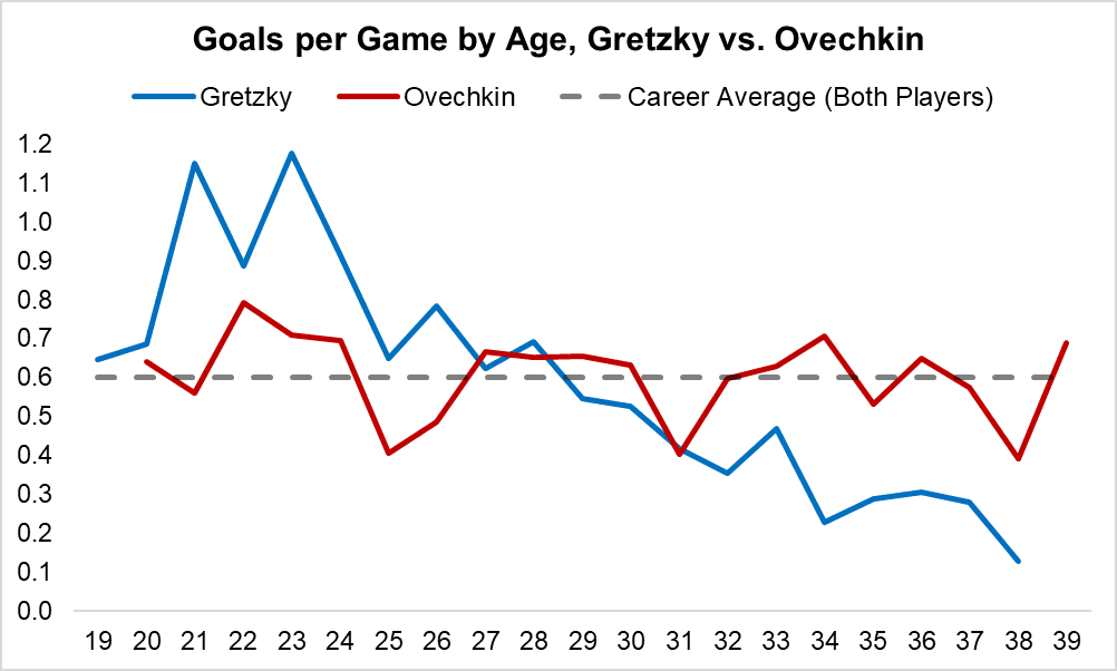 That bow shape shows Gretzky’s great start, followed by a less steep slope later in his career. It’s not so much that Ovechkin gained on Gretzky by being on the ice more often than the aging Great One; Gretzky, whose durability belied his size, played 47.9 percent of his career games in the second 10-year chunk of his career, including totals of 80 or more games in three of his last four seasons. With five games remaining in the Caps’ regular-season schedule, Ovi has played 48.8 percent of his contests in the second half of his career, a negligible edge. The primary reason Ovechkin has made up ground on Gretzky is that Ovi has simply laughed in the face of the aging curve and declined to decline, as illustrated by a graph of goals per game by age for each player.