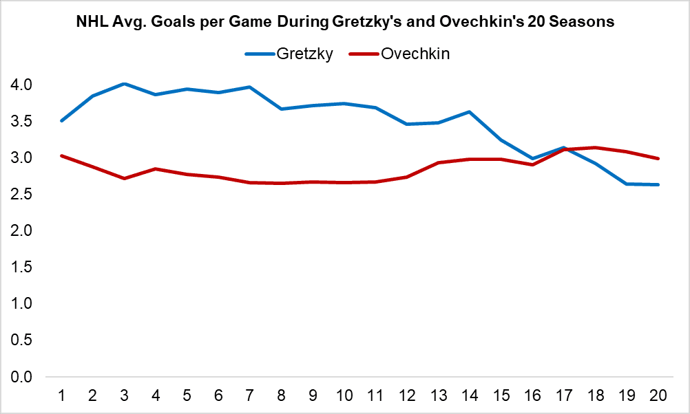 Of course, he’s had some help in recent seasons from the league’s scoring environment, which has grown more offense friendly. This next graph shows the leaguewide goals-per-game averages in each year of Gretzky’s and Ovechkin’s careers.