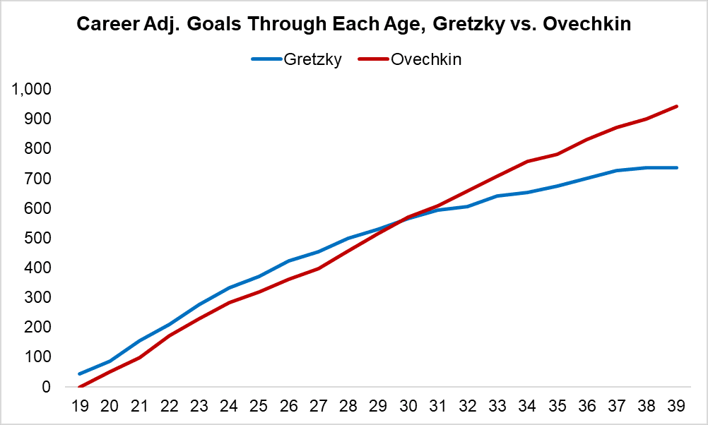 Alex Ovechkin was a prodigy and top prospect in his own right. But for the first half of his career, he never looked like the future GOAT goal scorer because, well, Wayne Gretzky existed. Ovechkin found the net 163 times through his first three seasons and 219 through his first four, which were phenomenal totals, but not as phenomenal as Gretzky’s (or Mike Bossy’s)—and Gretzky made his NHL debut when he was a year younger, too, thanks to the season-long lockout of 2004-5 that delayed Ovi’s arrival. Ovechkin scored the fourth-most goals of any player through his first five seasons, the fifth most through his first six seasons, and the seventh most through his first seven and eight seasons. He was on track to be one of the greatest goal scorers ever, certainly. But the greatest? Nah. Why would anyone have expected him to overtake Gretzky?