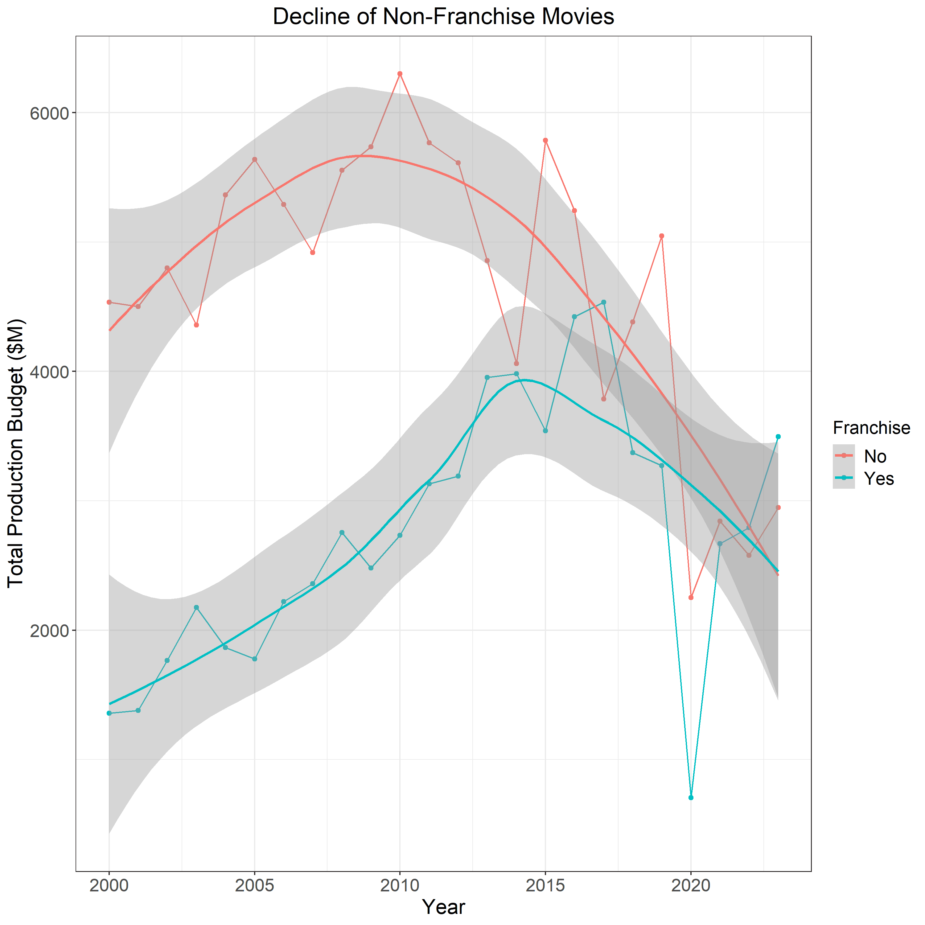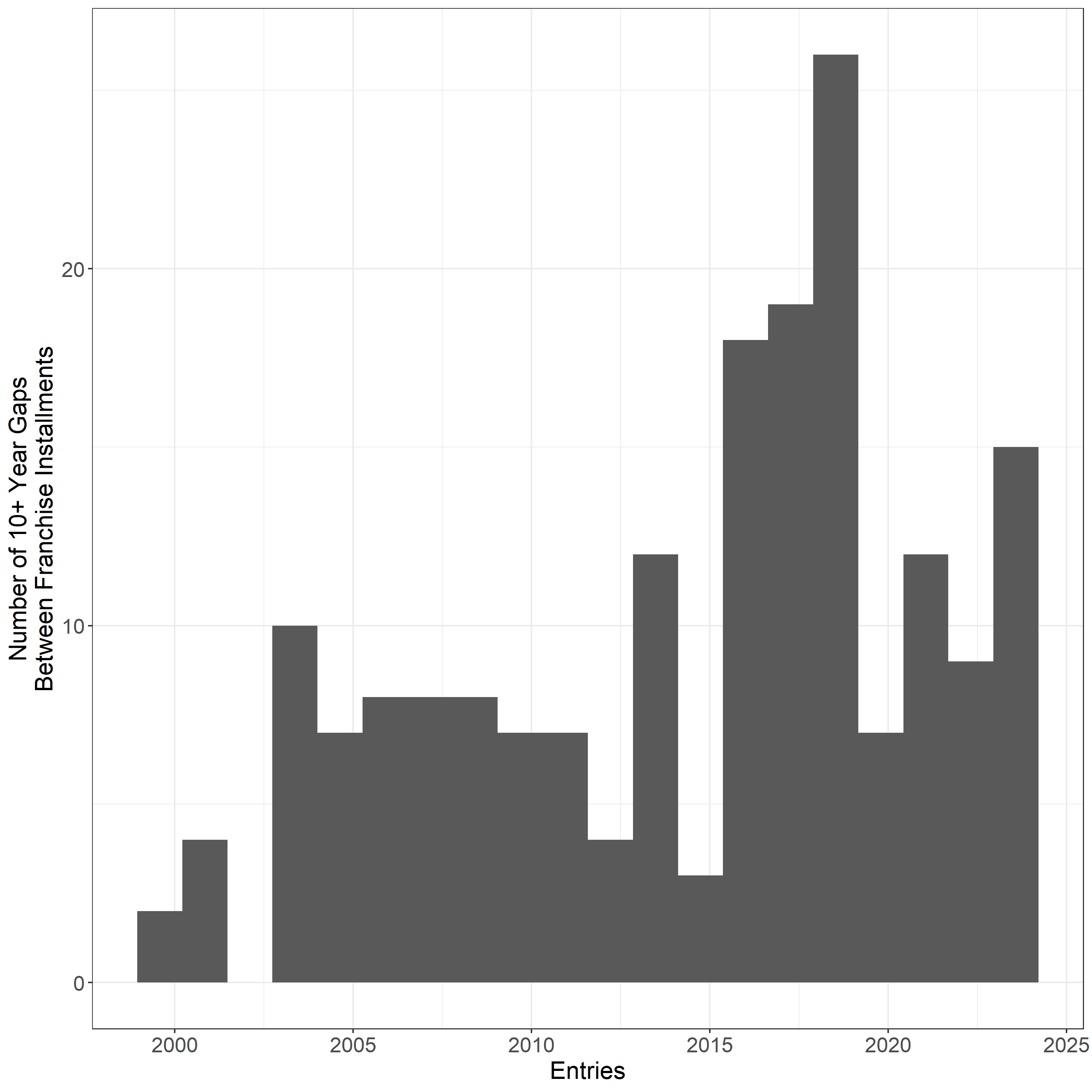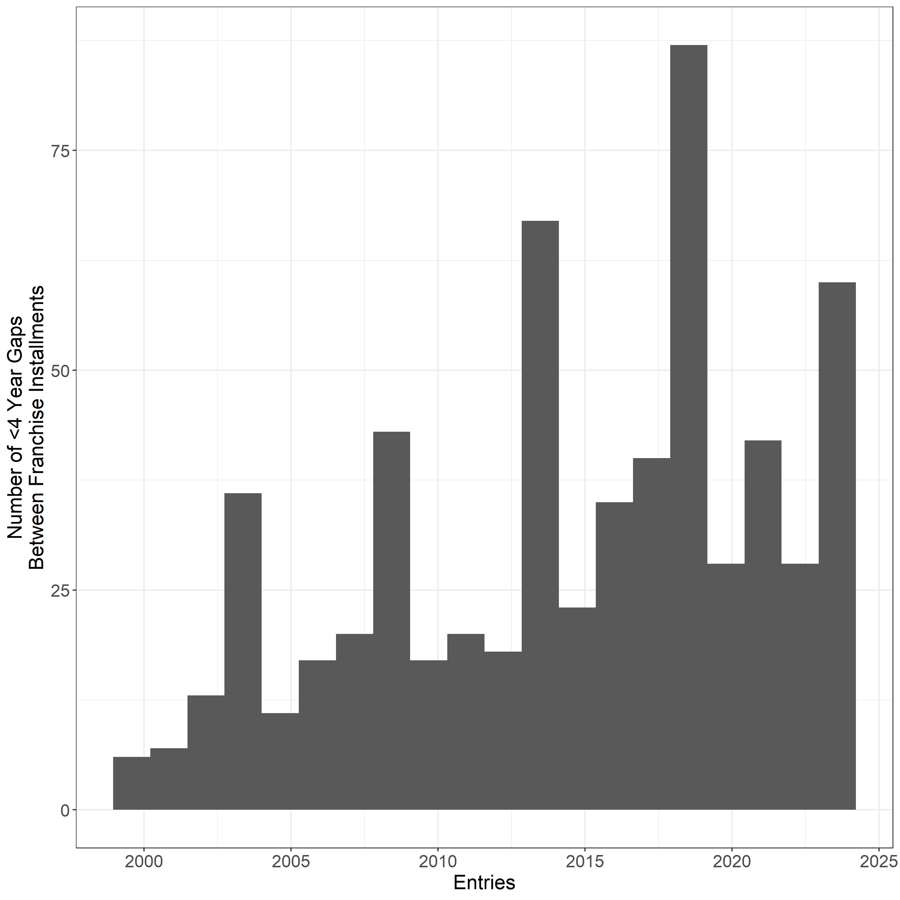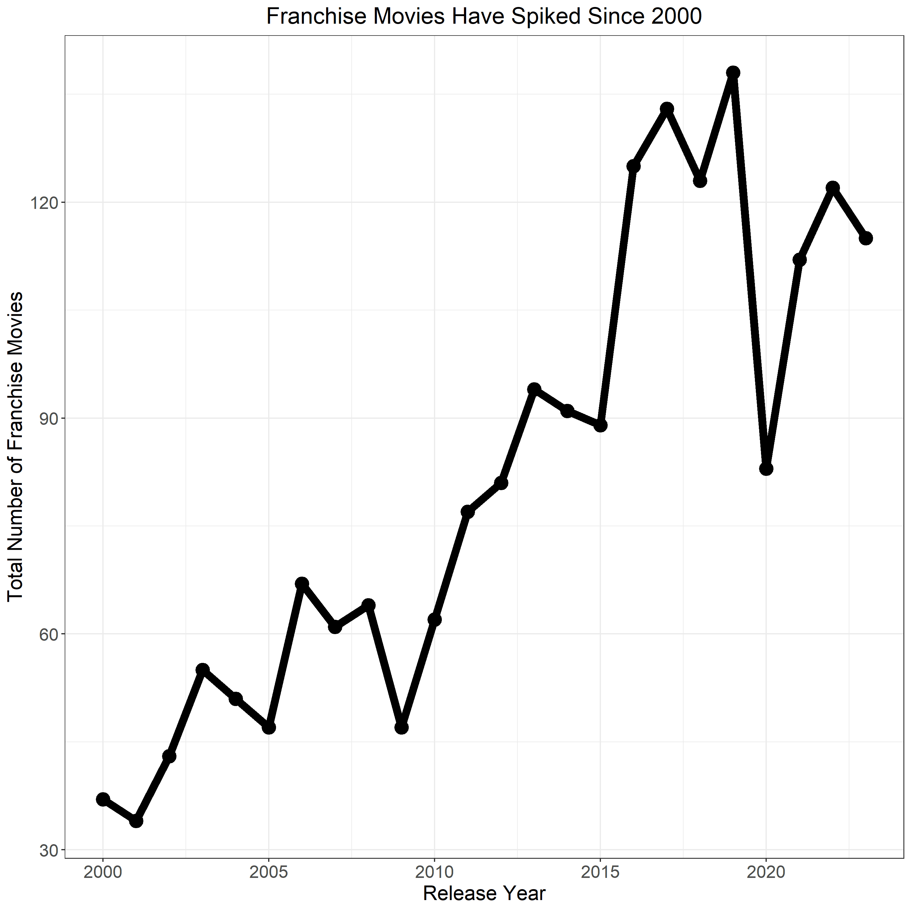 Another way to convey the industry’s pivot to franchises is through the sheer number of franchise films released each year, which has roughly tripled over the past 20 years.