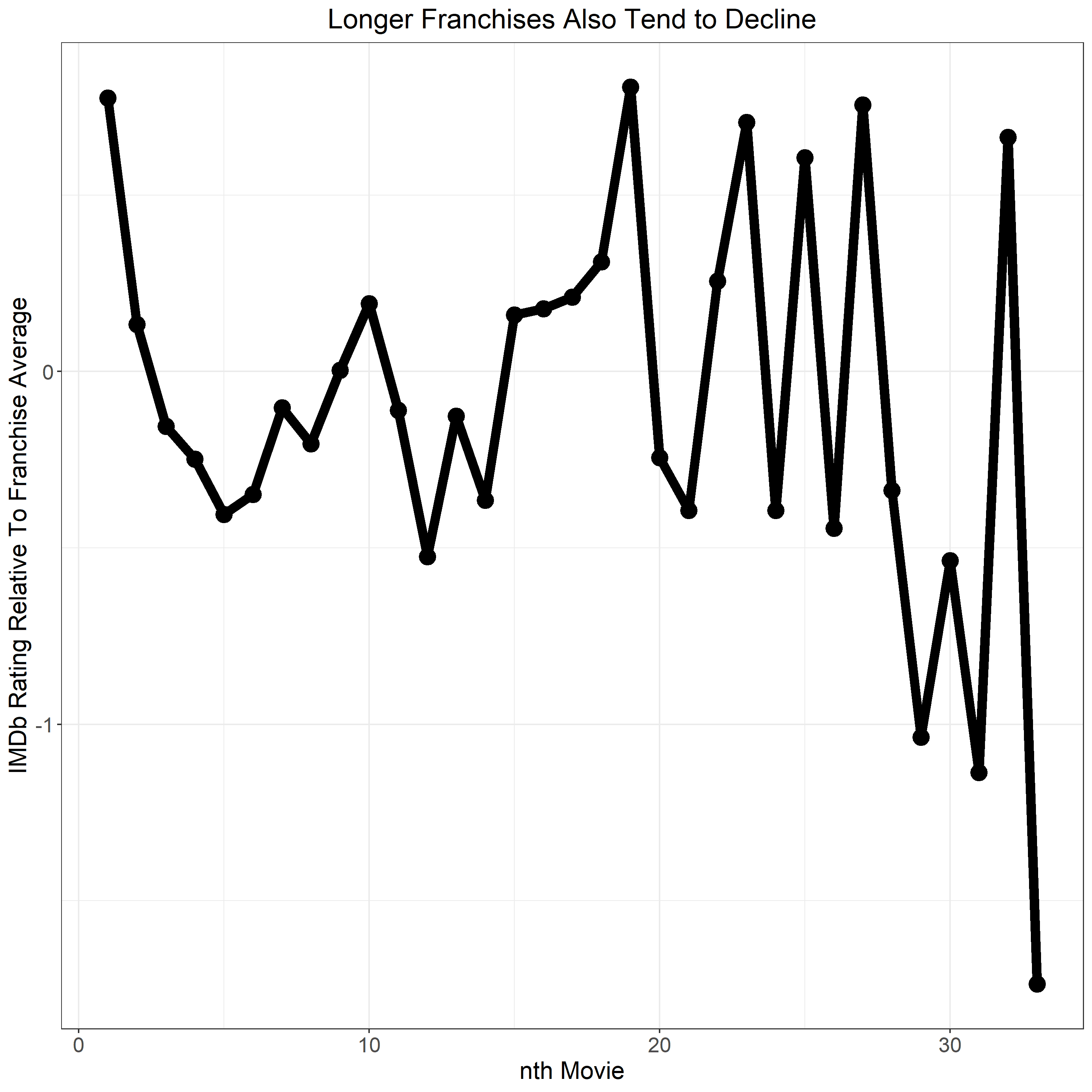To reduce that source of bias, then, let’s open up the pool to franchises of all lengths and look at how their IMDb ratings shift over time, relative to the franchise average: