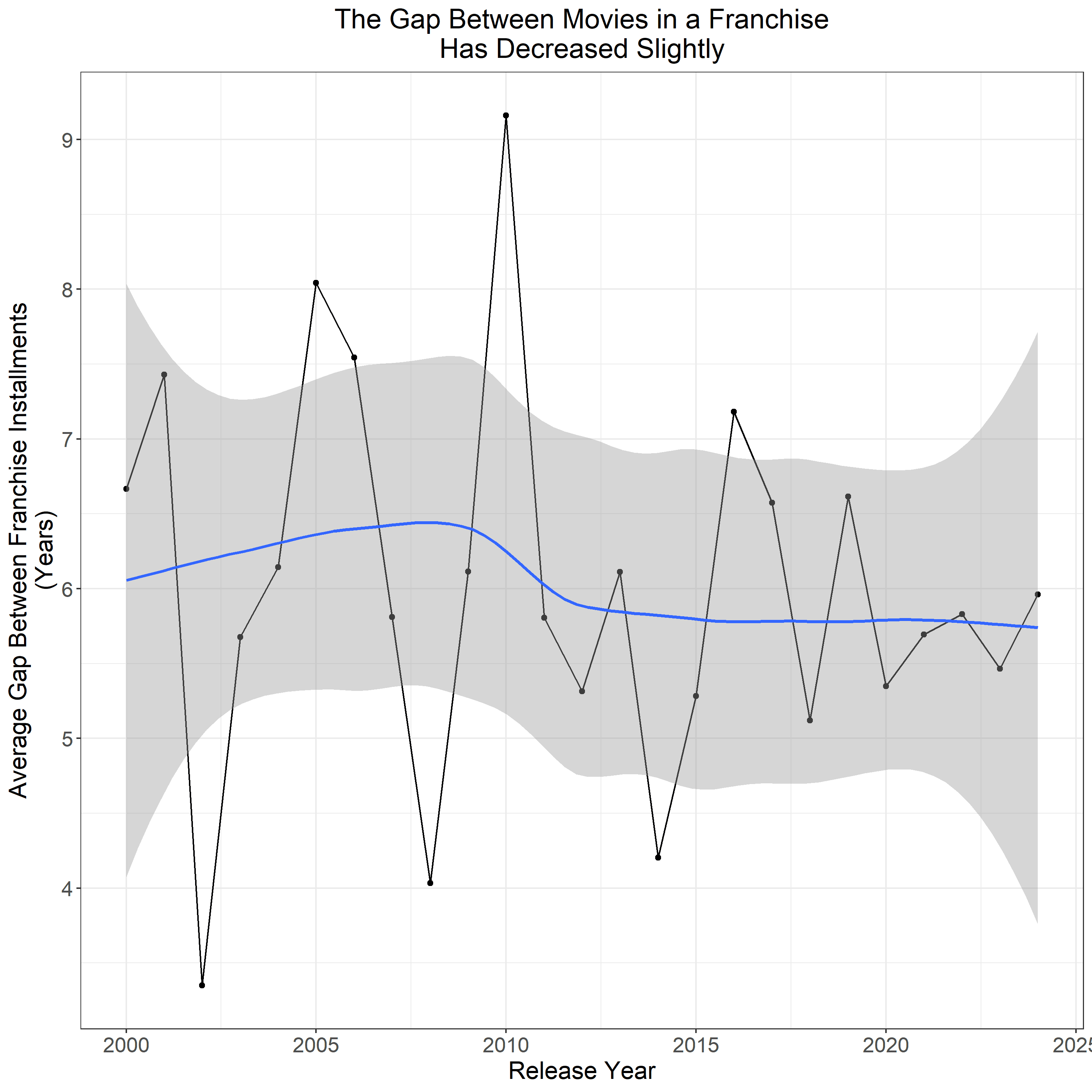 That’s somewhat misleading, though. What’s really happening is that some franchises (such as the MCU and DCEU) have dragged down the average by pumping out many movies a year, while others have inflated it by resurrecting IP that appeared dead for decades. Those two trends have come close to canceling each other out.