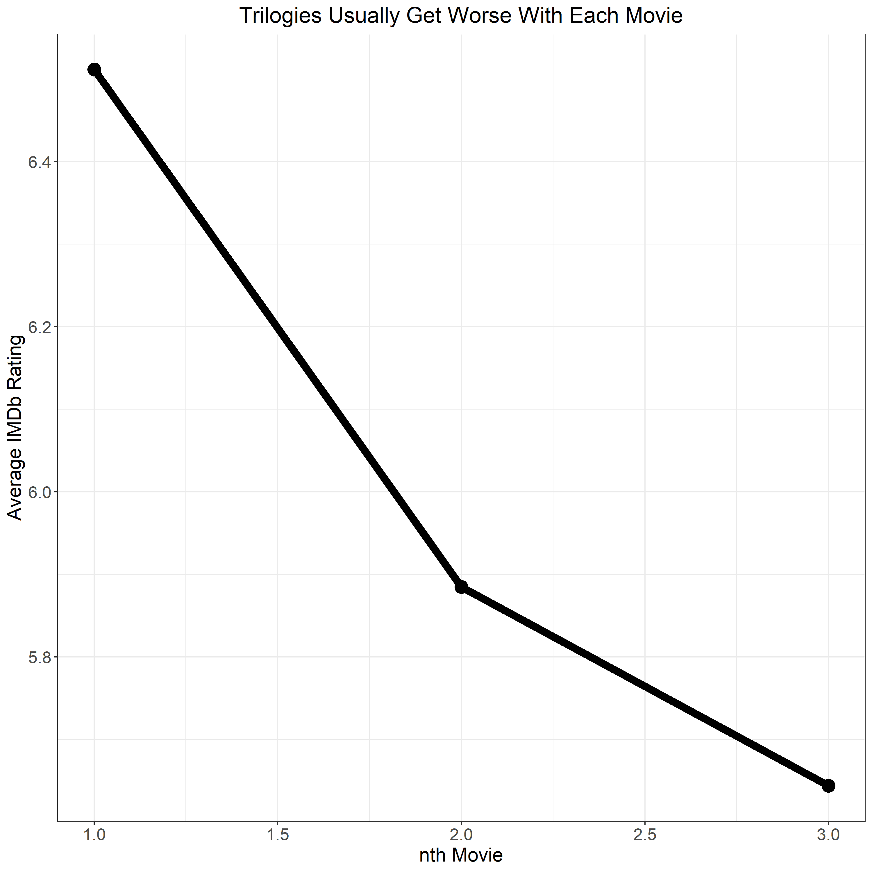 If we limit our inquiry to franchises with three installments, we find that their average IMDb user rating decreases with each release.