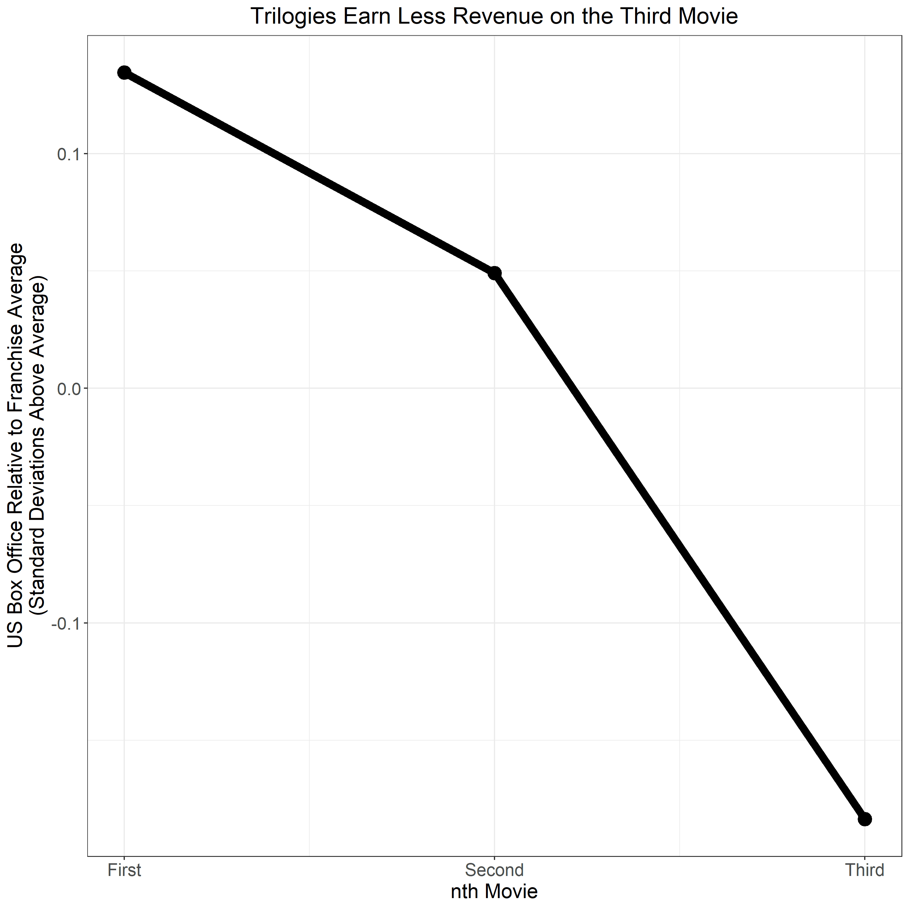 Admittedly, none of that means that the latter installments in veteran film franchises tend to be bad box office earners; it just means that they tend to be less lucrative than the earlier installments. (Indeed, if we compare even later franchise films’ performance to the box office baseline, instead of the standard for that franchise only, the franchise films do better—though they also typically cost more to make.) The Force Awakens made much more than The Last Jedi, which in turn made more than The Rise of Skywalker, but this is still Star Wars we’re talking about; even the last entry in that trilogy of trilogies made more than $1 billion worldwide.