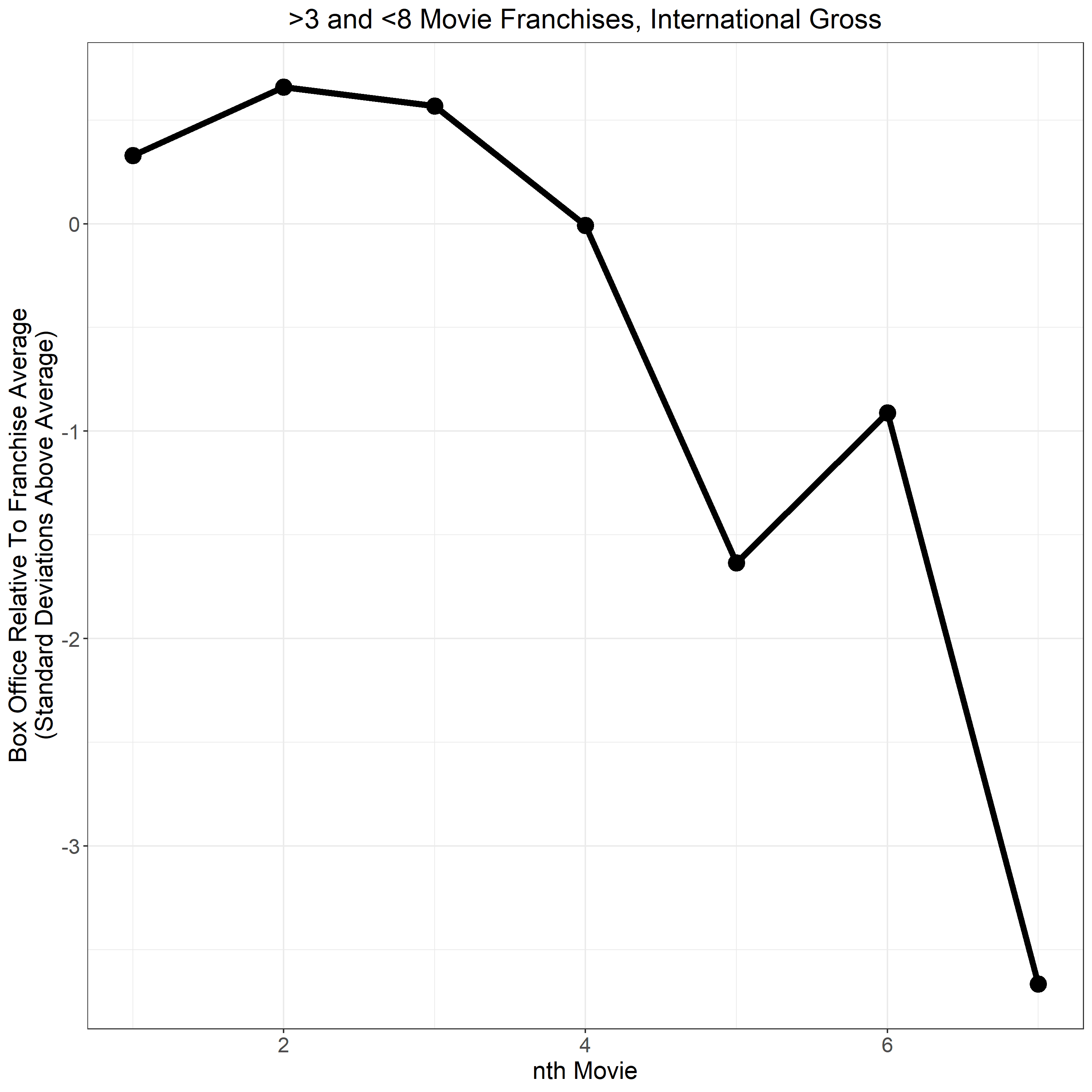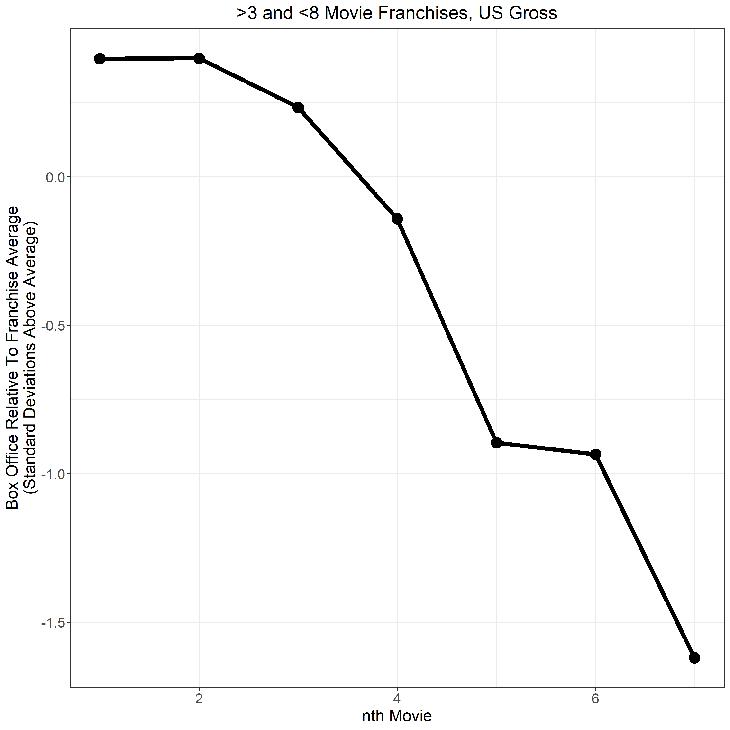 The same selection bias we warned about in our earlier three-film-franchise charts potentially also applies to these, so once again, we can unskew the sample somewhat by pulling in longer-running franchises. Once again, we see a steady decline in revenue, relative to the inflation- and marked-adjusted franchise baseline.