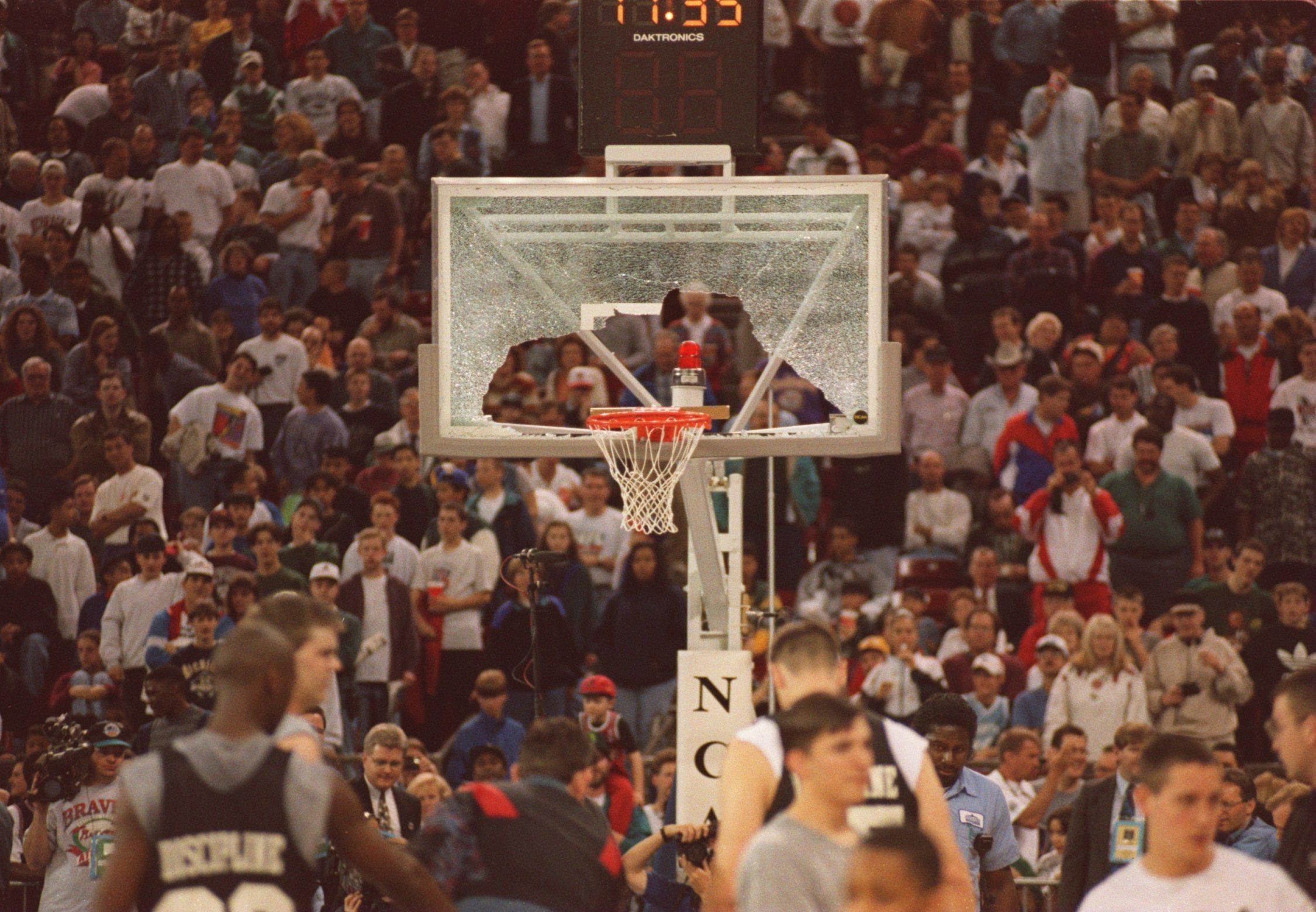 “We was just doing a drill where one of the coaches tosses it up off the backboard,” he says. “You go get it. You stick it back in the hole. You try to dunk it. Coach Dickey gave me a perfect pass off the backboard so I decided to try to dunk it backwards, and when I did it just happened to shatter. Only thing I heard was a big crash, and here come glass.”