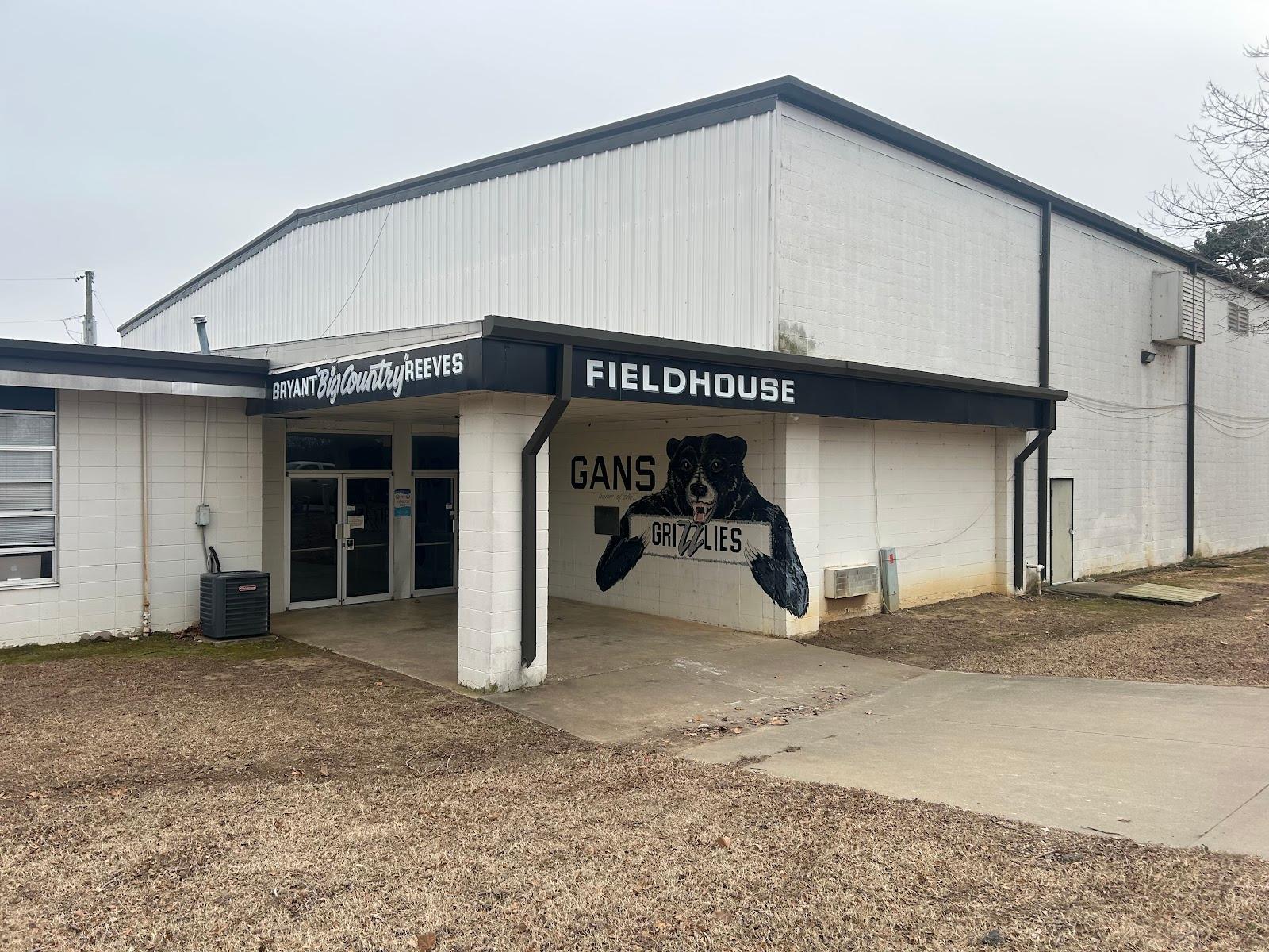 Some yards empty, some adorned with various modes of transportation. Riding mowers and trucks, dirt bikes and Winnebagos and boats. I got into a staring contest with a horse. The post office was next to a building that housed both the town hall and senior center. Roadside ads hawking satellite internet. Roadside ads for Jesus. And then there’s the school and the Bryant “Big Country” Reeves Fieldhouse. There’s a bear on the wall outside the entrance. Beside his head: Home of the Grizzlies.