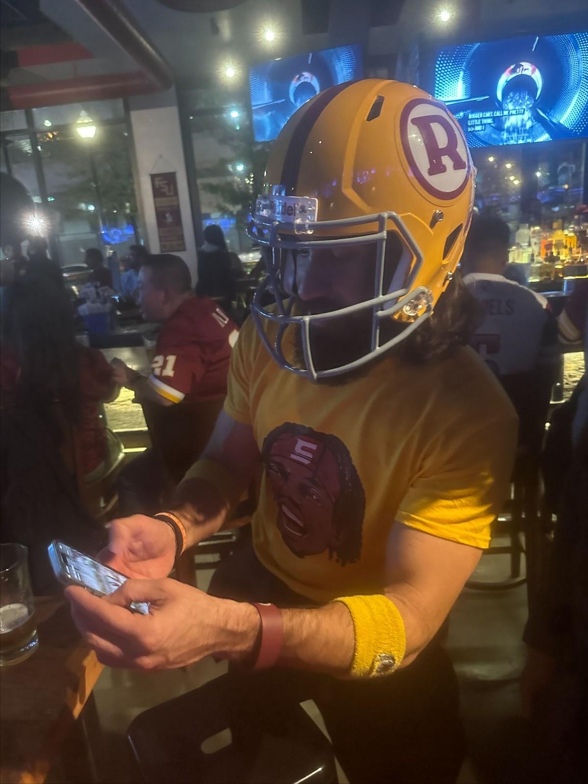 Back at Walter’s, after celebrating a Washington touchdown in that Week 11 game, Dimitri showed me his phone. His background was a photo of the Hail Mary from Week 8—and there, sitting in the front row just behind the play, was Dimitri, wearing a helmet and screaming. His father had passed away a few weeks earlier, and Dimitri almost didn’t go to the game. But the day before, he scooped up a single ticket—his first time in the front row.