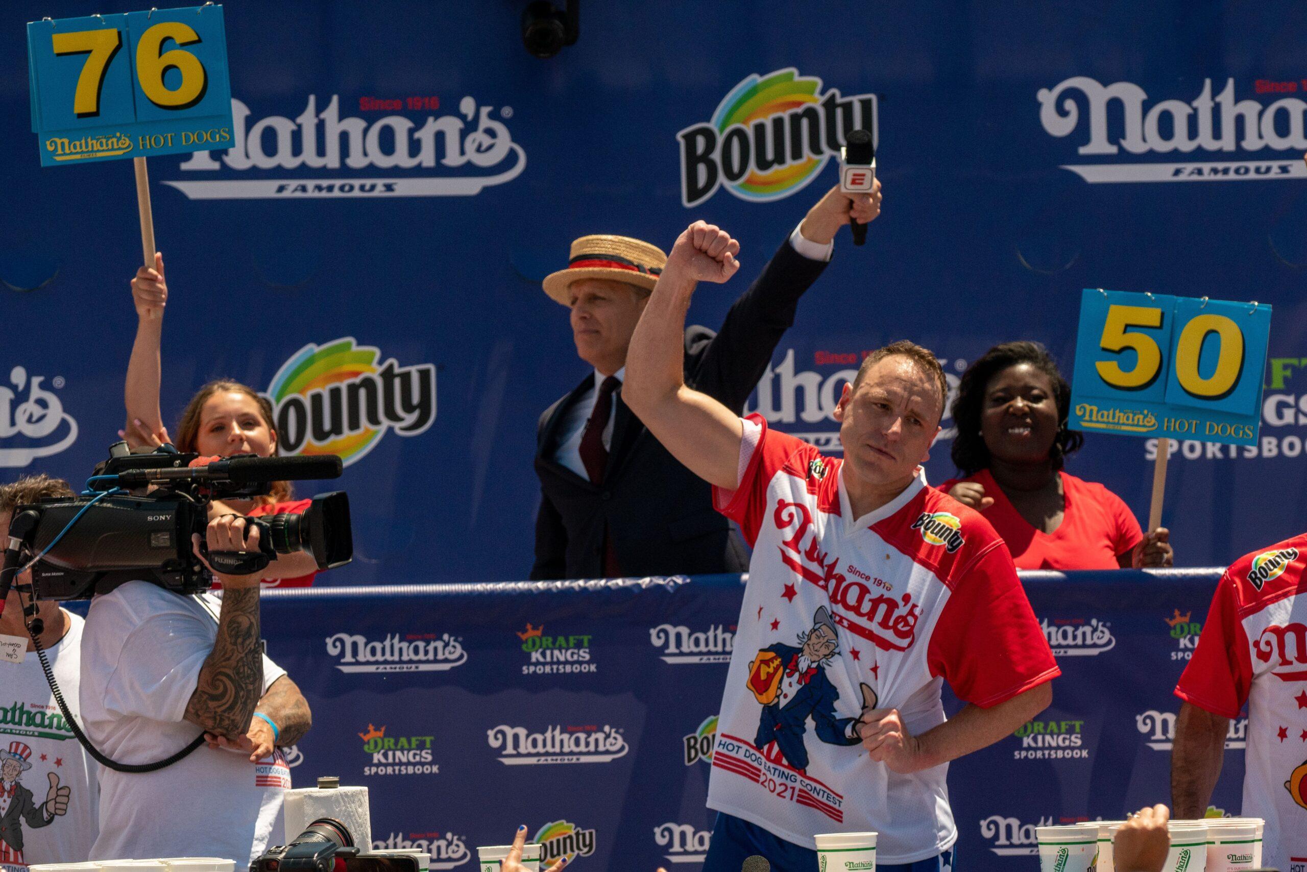 Two years later, 2.7 million people tuned in to ESPN to watch Chestnut eat 61 hot dogs in 10 minutes; then, in 2021, he set the reigning Nathan’s Hot Dog record with 76 hot dogs and buns eaten.