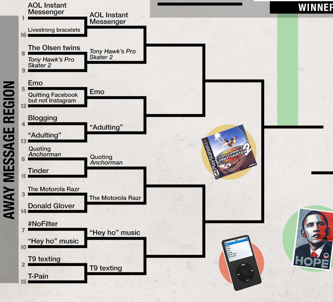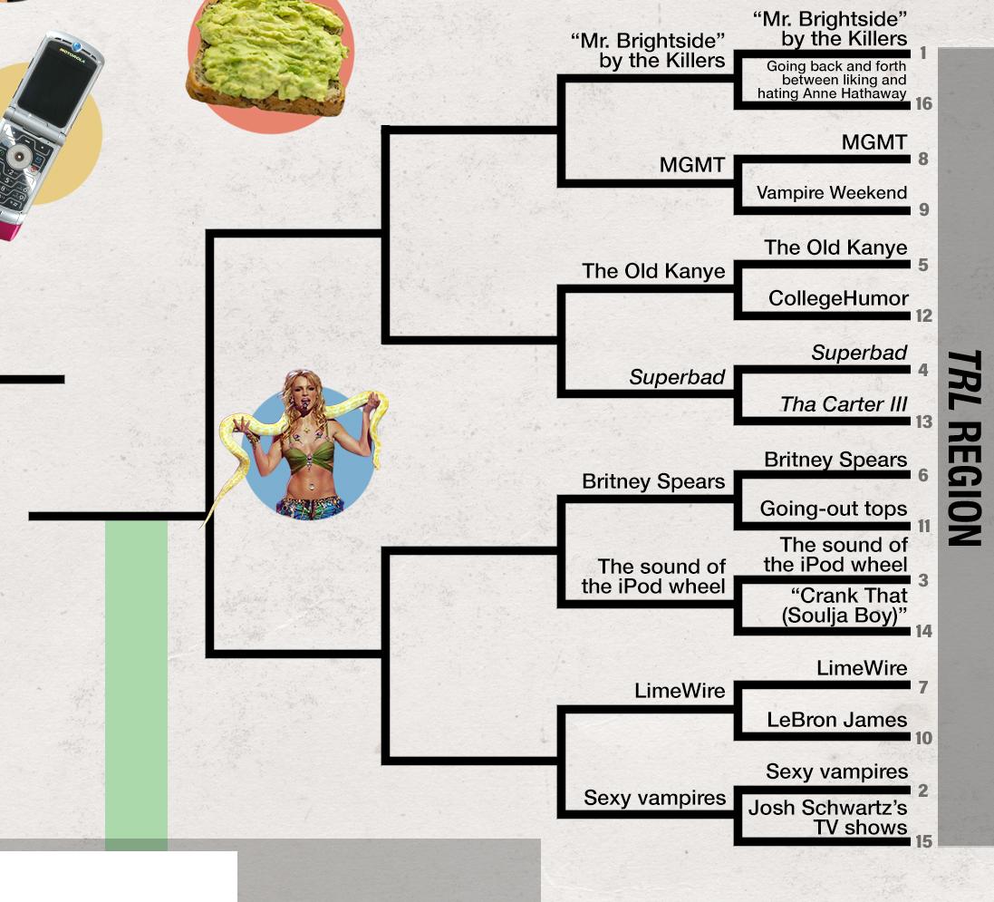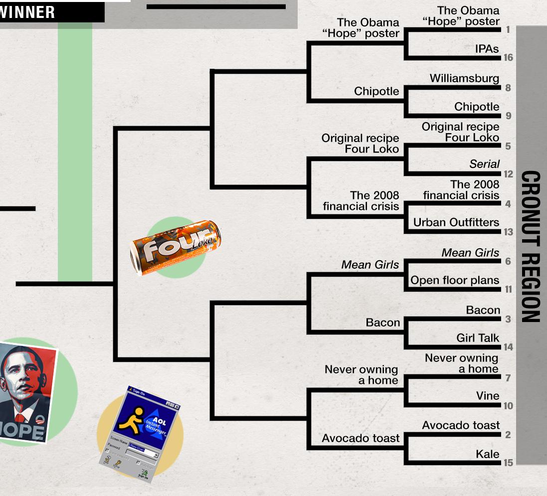 But also, looking into the numbers, I wouldn’t exactly expect similarly chalky results on Tuesday—there are still some Cinderellas lurking. The Office and LimeWire, both 7-seeds, turned in overwhelming performances in Round 1; the aforementioned Chipotle destroyed a neighborhood in Brooklyn and now looks to take down an entire president. (Just calling my shot: I think a 1-seed goes down in Round 2.) The matchups here are truly tremendous: “We Are Young” by fun. taking on student loan debt, kindred spirits if you think about it; emo versus “adulting,” a matchup that encapsulates the full scope of millennial-dom; original recipe Four Loko taking on the 2008 financial crisis, a case where the latter thing more or less caused the rise of the former; and never owning a home versus avocado toast!!!