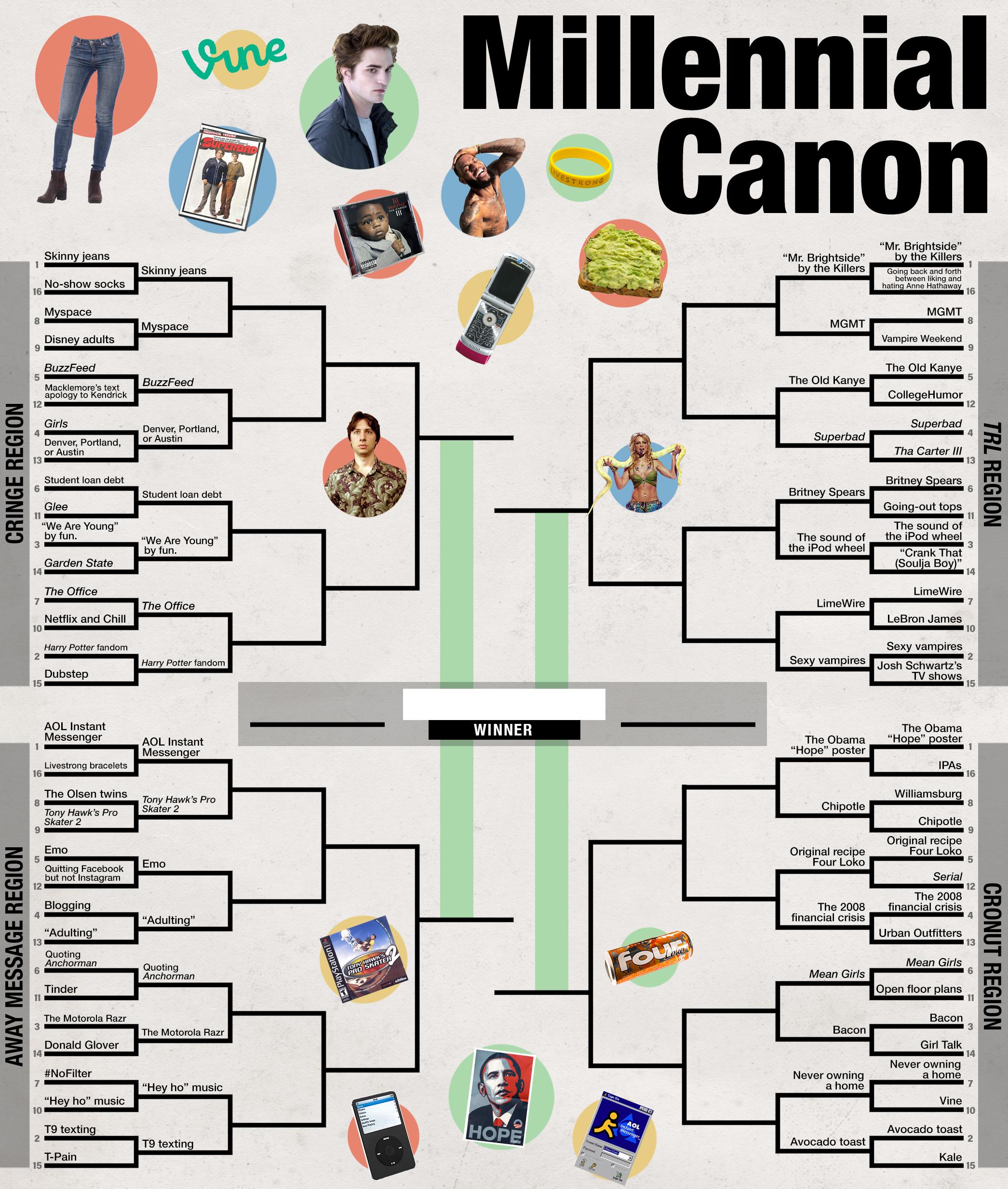 Editor’s note: The second-round polls have closed. See the ultimate winner here! You can also check out the millennial cringe canonall the submissions we received for the Millennial Canon Bracketand Brian Phillips’s think piece on millennial contradiction.