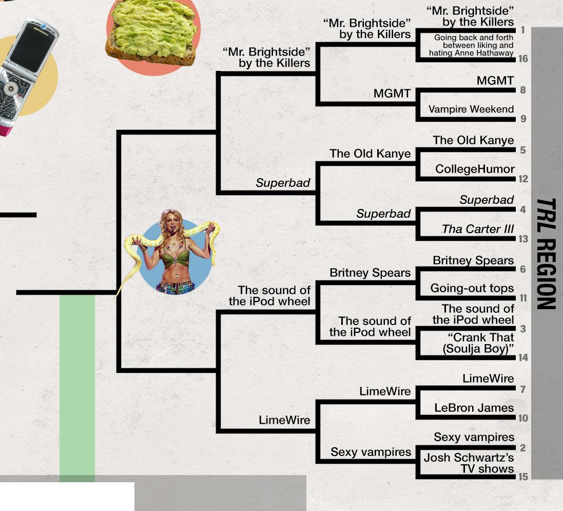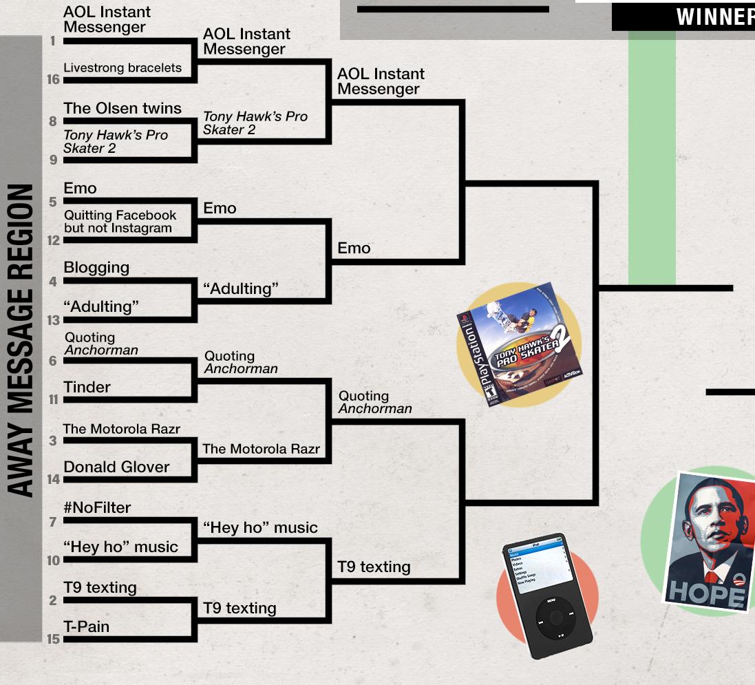 But a few favorites have also emerged. In the Away Message Region, two pieces of long-gone tech have spent the early rounds devouring their competition. AOL Instant Messenger—which, of course it’s a juggernaut; we named the region after it—has averaged 73 percent of the vote in its matchups against Livestrong bracelets and Tony Hawk’s Pro Skater 2, while T9 texting took down two hallmarks of the millennial sound, T-Pain and “hey ho” music, with an average of 70 percent. Emo and quoting Anchorman won’t go quietly, but we seem destined for a face-off between the 1- and 2-seeds of the Away Message Region.