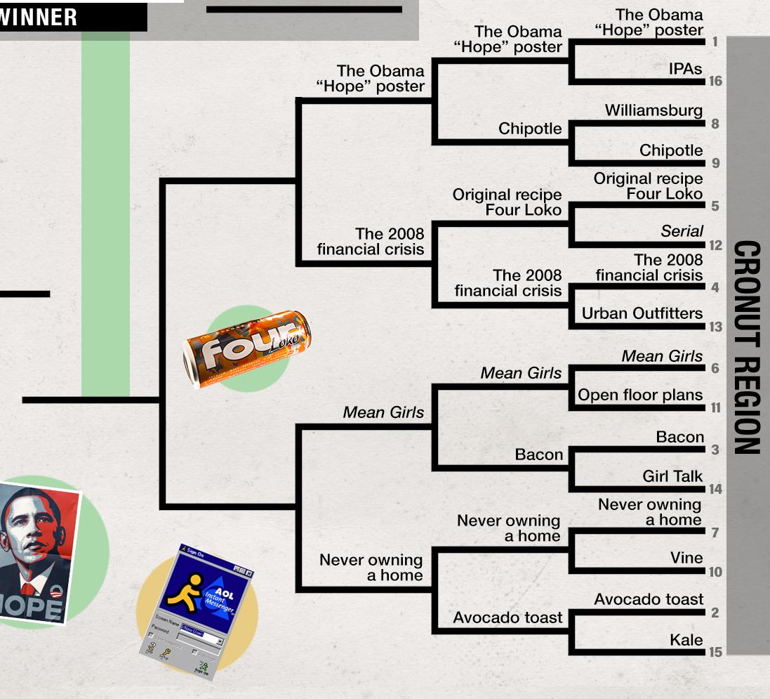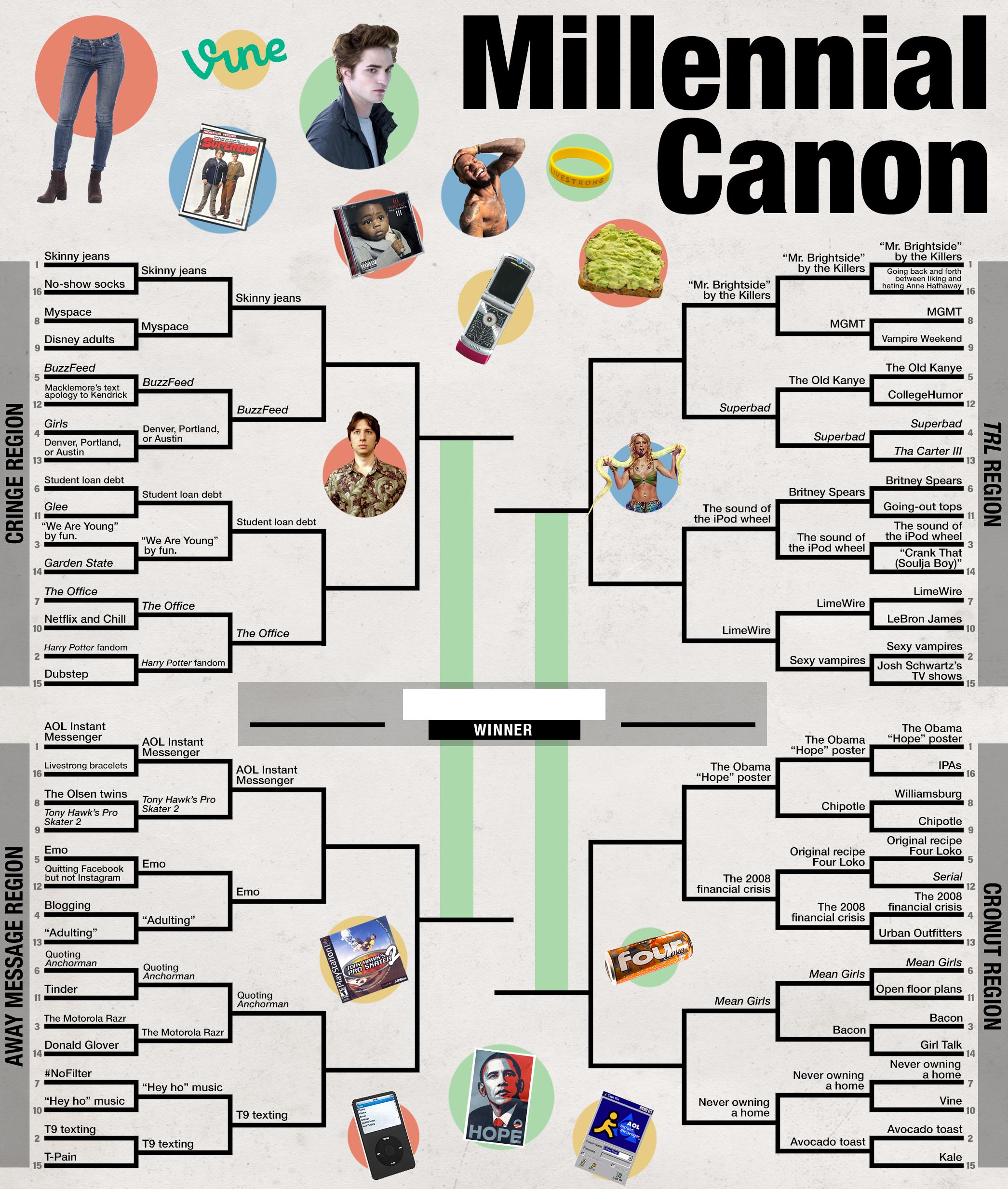 After a first round that was mostly defined by blowouts, the round of 32 was littered with difficult decisions for our voters. We’ve been running brackets for five years now, and this round of the Millennial Canon produced two of the closest margins we’ve ever seen: Over in the Cronut Region, 7-seed never owning a home took down its nemesis, 2-seed avocado toast, with just 50.8 percent of the vote. And somehow, even closer than that, 5-seed emo held off the Cinderella 13-seed “adulting” with just 50.1 percent of the vote. In the former matchup, the two entries were separated by 238 votes; in the latter, they were separated by just 38! It’s like millennials always say: Every vote counts.