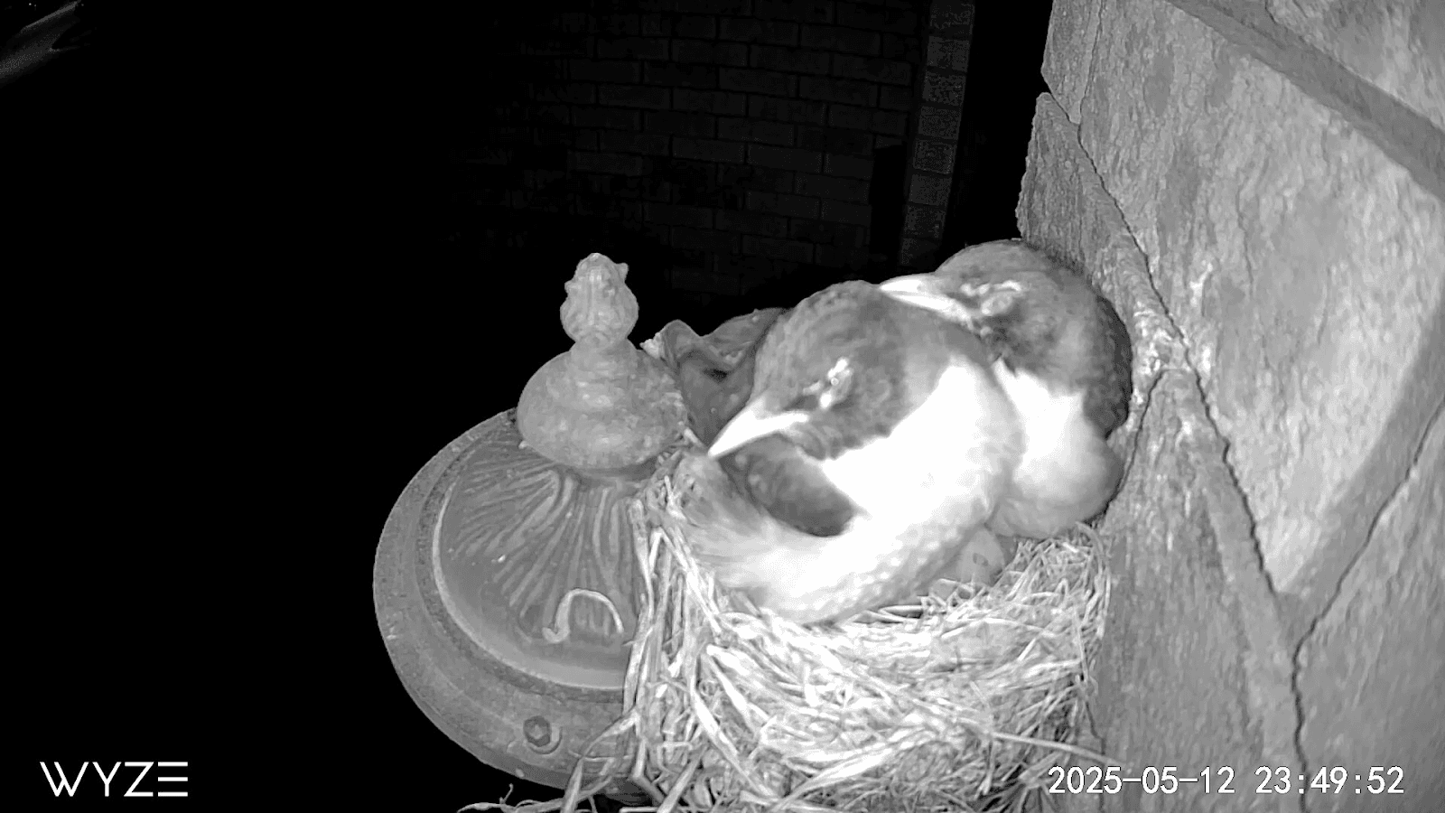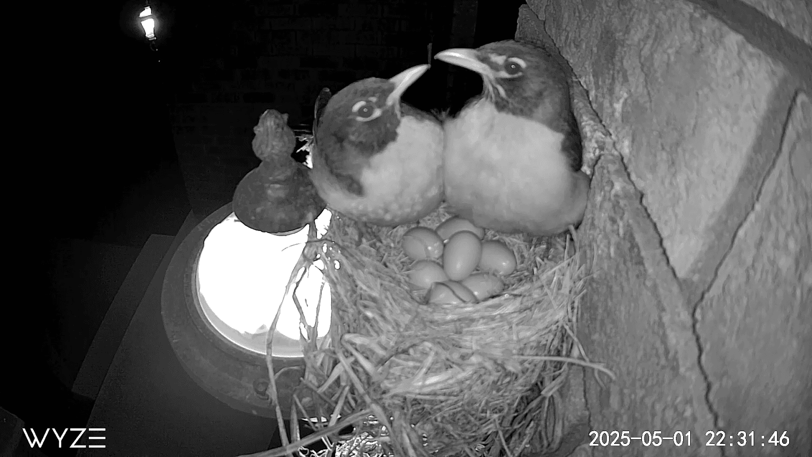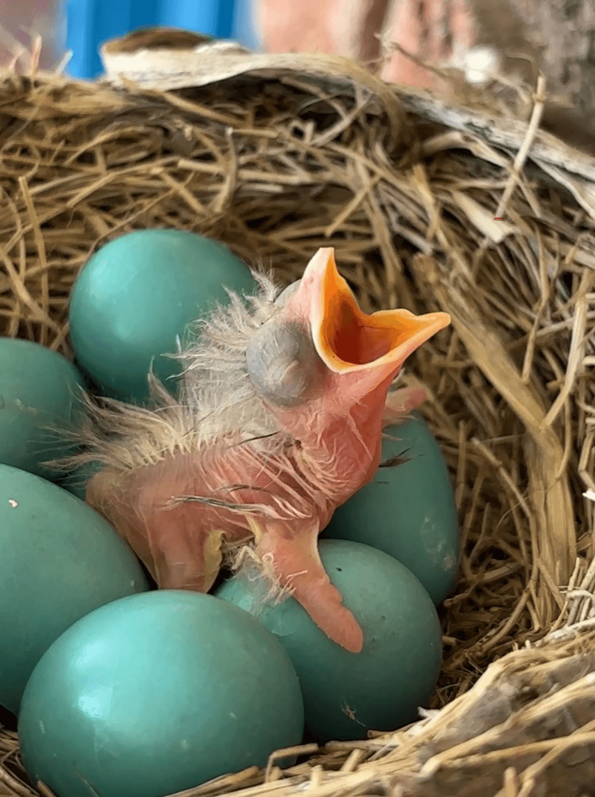 Worried that the overly full nest might lead to eggs or chicks falling or being pushed out, Copeland bought a hanging pot that she filled with leftover nesting materials and soft plants from around the neighborhood and set it up directly under the nest. As a further failsafe, a bench about 4 feet under the nest was already covered in soft padding—which saved the day last week when one mother robin was spooked and took off suddenly, sending two eggs flying out. The eggs landed safely on the padding, and Copeland, who has carefully monitored the footage in real time, slipped them back into the nest minutes later. They were already showing “pips,” tiny fractures that precede a baby bird’s emergence from its egg, and they hatched soon after.