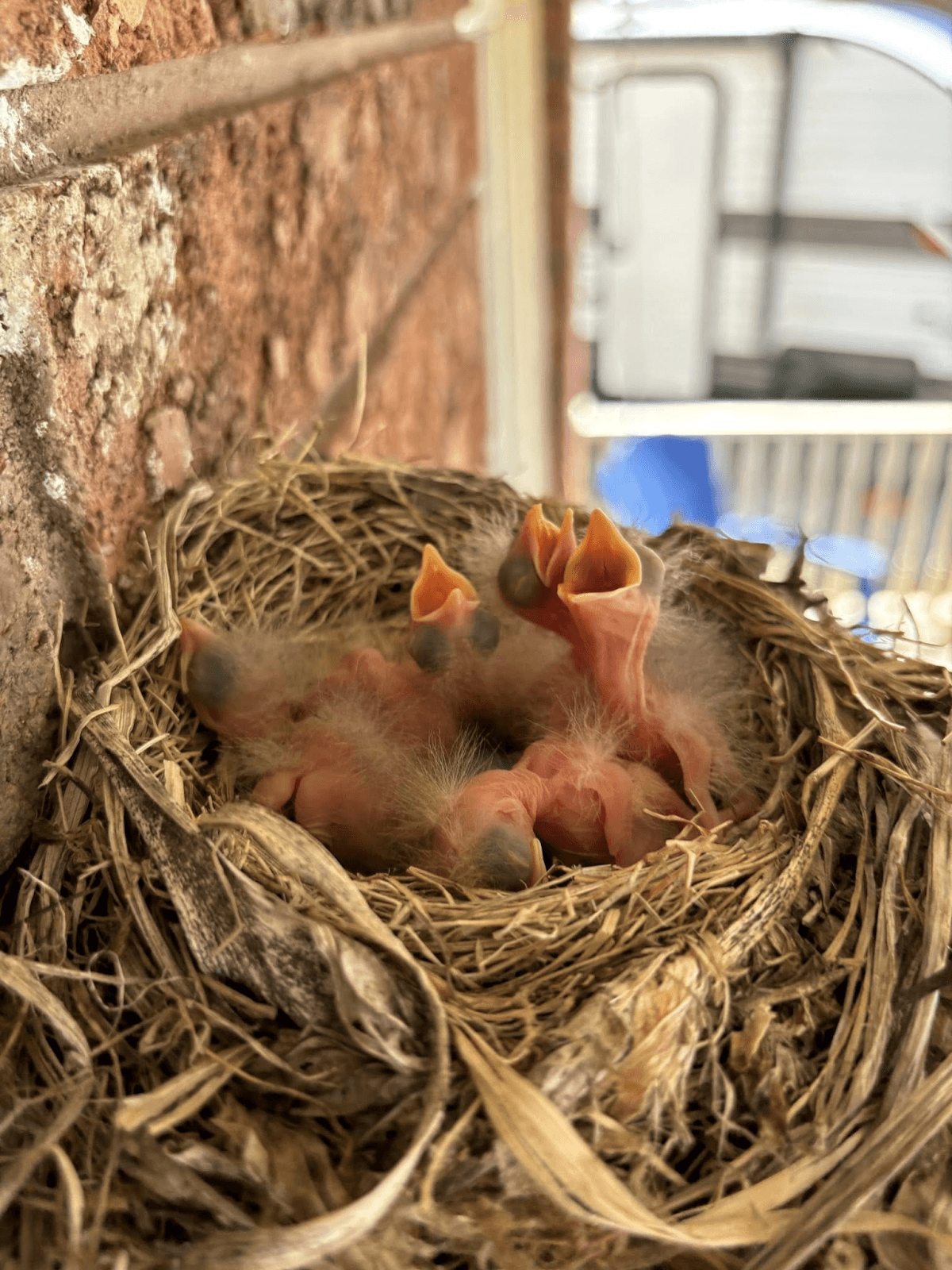 By now, the mother robins have settled into a cautious peace with each other. The night before we spoke, Copeland caught one robin sleeping with her beak resting on the back of the other. Copeland says they’ve started dive-bombing her when she visits the nest to take a picture but otherwise sit on her railing, cheeping furiously. “They really yell at you,” she says, and she’s tried to give them as much space as a home next to her front door will allow.